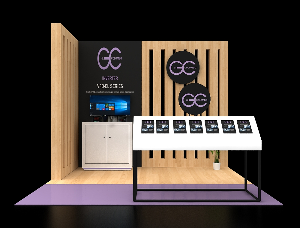 This 10x10 inline stand maximizes display space with a full graphic backdrop featuring a header. Digital monitors are mounted centrally above a long, wood-finished counter. This counter incorporates three concealed storage cabinets beneath. A prominent, illuminated reception counter sits near the front, all defined by dark wood-look flooring.