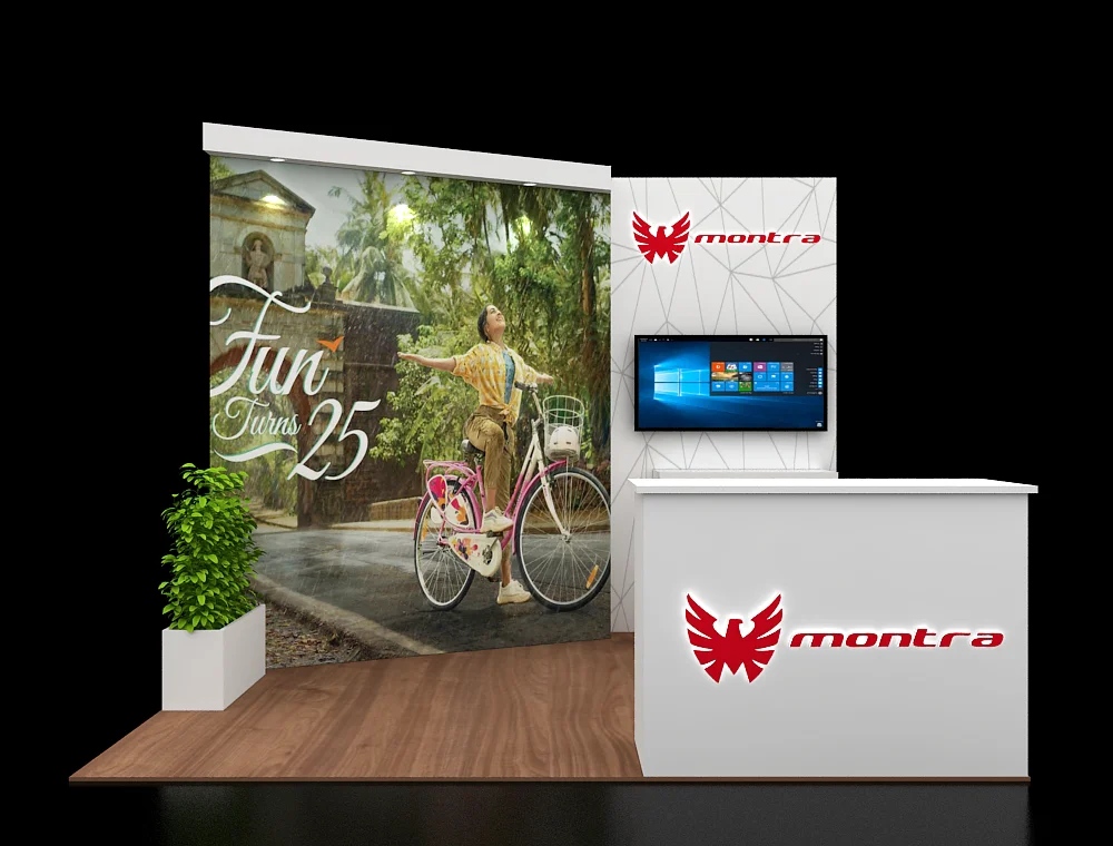 This 10x10 corner configuration features a large-scale graphic back wall adjacent to a vertical wall section. The vertical wall holds an integrated digital screen above a white, lockable storage cabinet. Dark wood-look flooring defines the space, which includes a branded reception counter positioned toward the front, and a decorative planter.