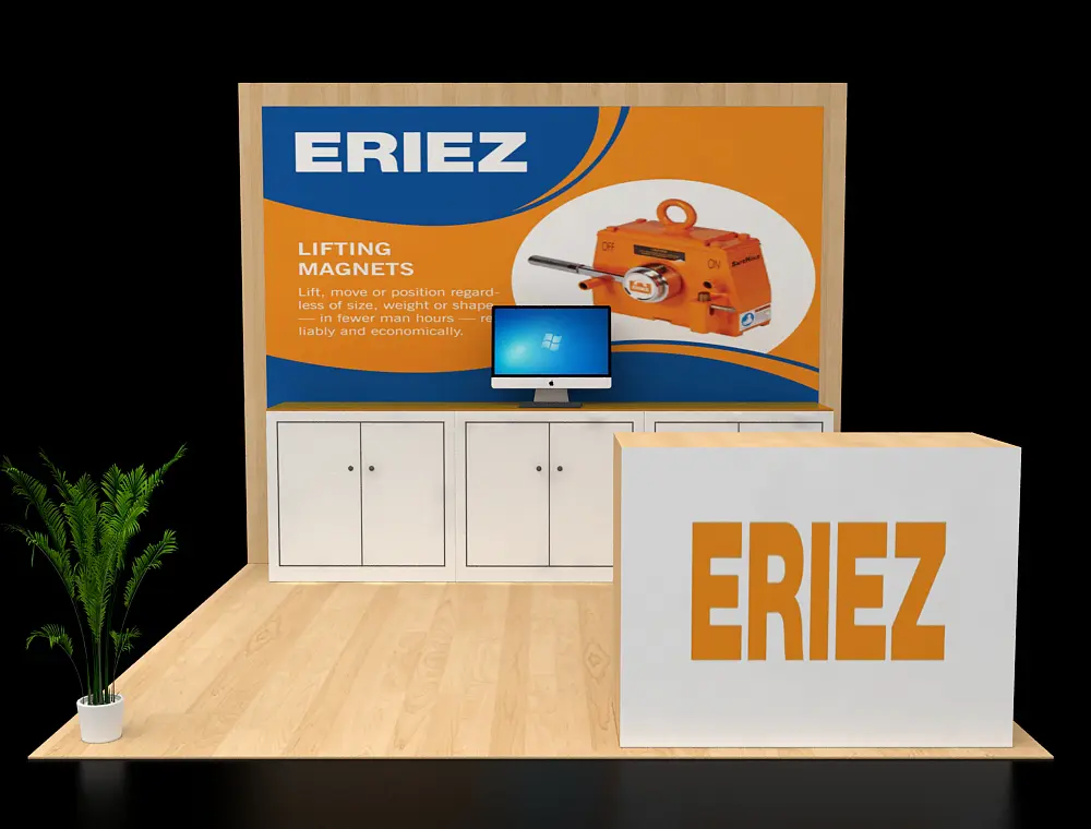 A 10x10 open-concept exhibit is displayed, integrating a main reception desk with integrated literature holders. The layout includes a meeting area defined by a table and four chairs. Wood-look and graphic wall panels create separate zones, enhancing the presentation space, all set on a light-colored raised floor.