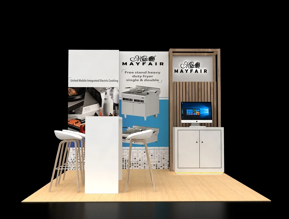 This 10x10 inline exhibit uses contrasting white and natural wood paneling. A high white presentation table with two matching stools creates a standing engagement area. A separate wooden-framed structure houses a computer monitor display set above a lockable storage unit. Light wood-look flooring defines the space.