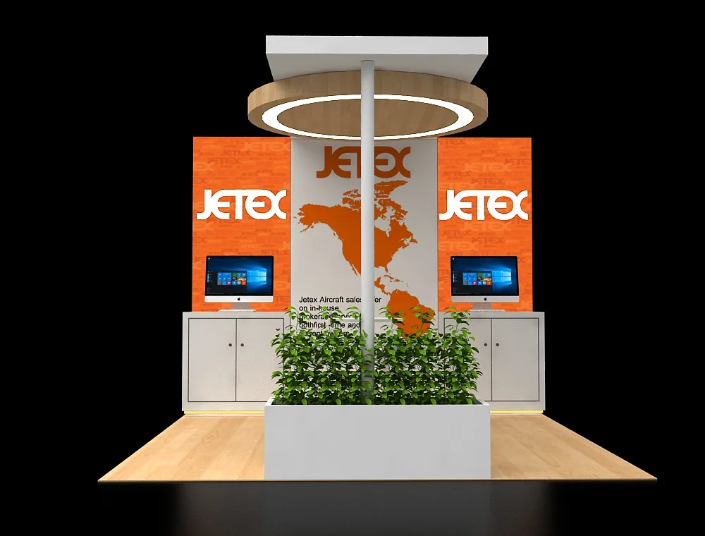 This 10x10 display utilizes freestanding vertical panels and curved walls. Key features include a prominent reception pedestal, a semi-enclosed product viewing area with a screen provision, and a compact round meeting table. A metal literature rack is positioned toward the perimeter. The design features high-contrast graphics.