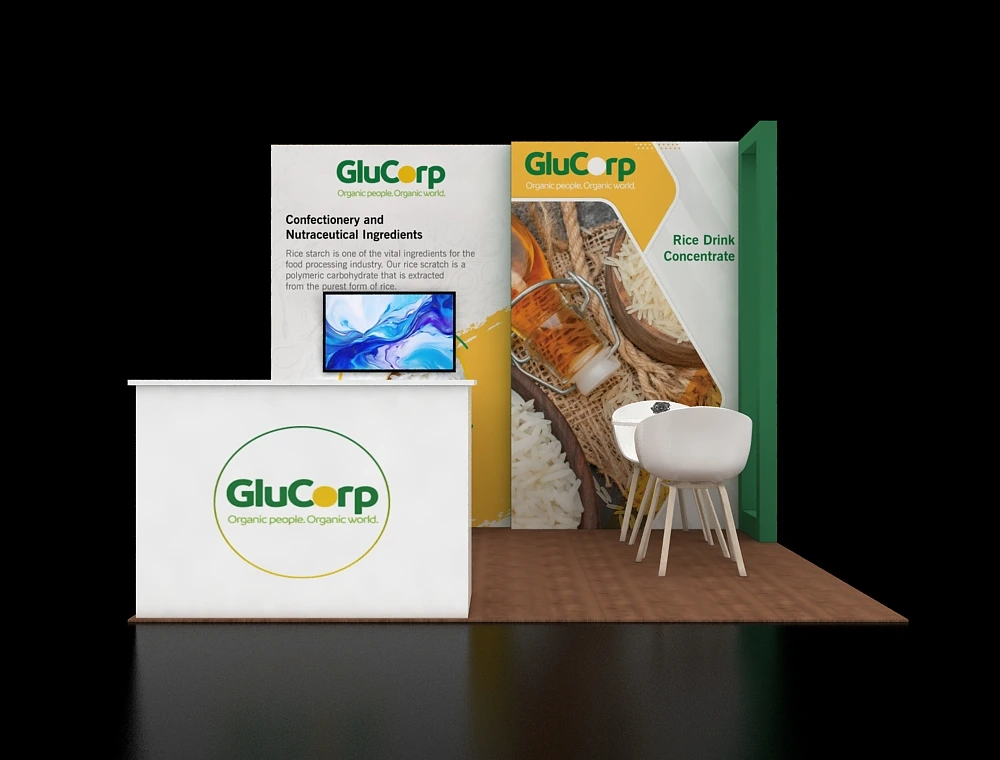 This 10x10 exhibit features a segmented back wall for graphics, incorporating a cabinet for media display. The layout includes a front counter and a distinct meeting space with small white chairs and a table, all set upon a dark wooden floor finish.