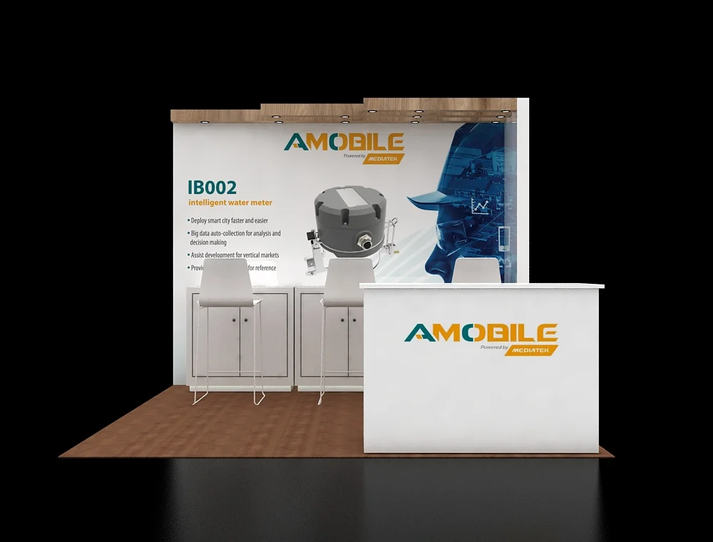 The 10x10 inline booth is designed with a primary reception counter and a rear wall featuring a long, bar-height counter. This rear counter incorporates multiple lockable cabinet storage units below and provides four high stools for meetings. Wood-look headers and strip lighting top the back wall.