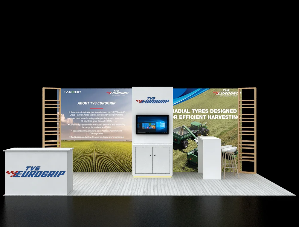 The 10x20 inline exhibit incorporates a central media column featuring a flat-screen monitor and lockable storage. Flanking the main graphic wall are two vertical product shelving towers and two distinct service counters: one for reception and one for high-top visitor engagement with bar stools.