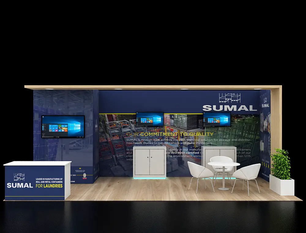 This 10x20 exhibit features a wood-accented canopy over a navy graphic back wall. It includes three integrated monitors above lockable storage cabinets. A comfortable central lounge area has a round table and four white chairs. The structure is completed by a full-height display panel on the far right and a planter box accent.