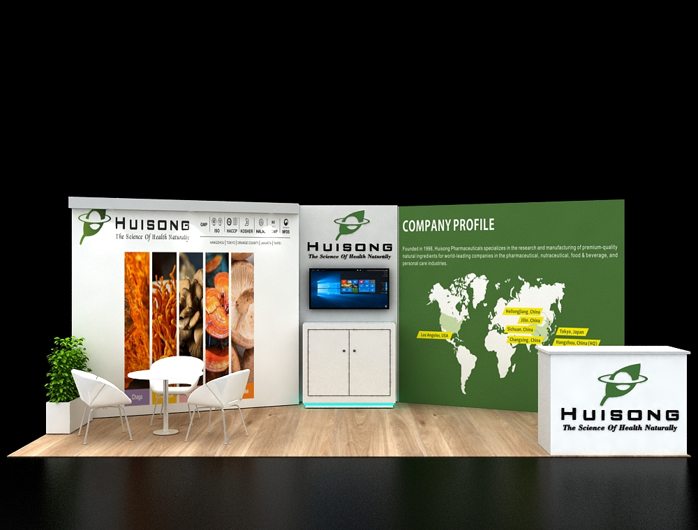This 10x20 display is defined by a full-width back wall divided into graphic and text panels. A central media station includes a monitor over a storage cabinet. The right section features a large world map graphic, and a back corner includes a subtle access door. The booth is completed by a round seating cluster and a front reception counter.
