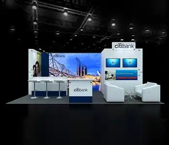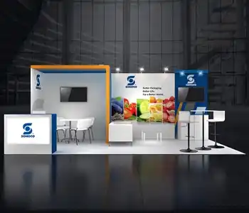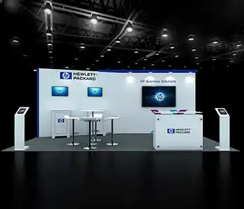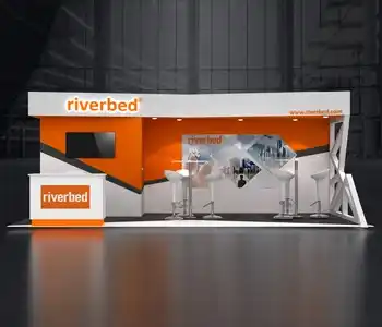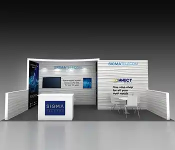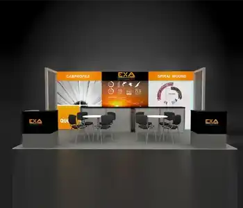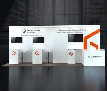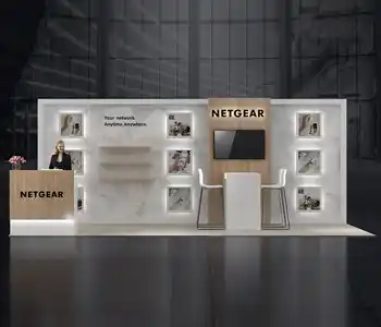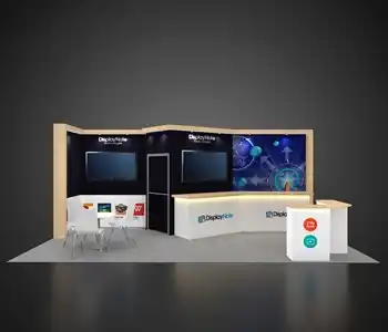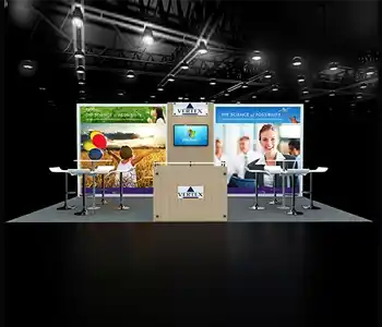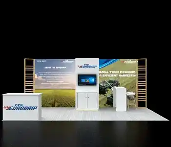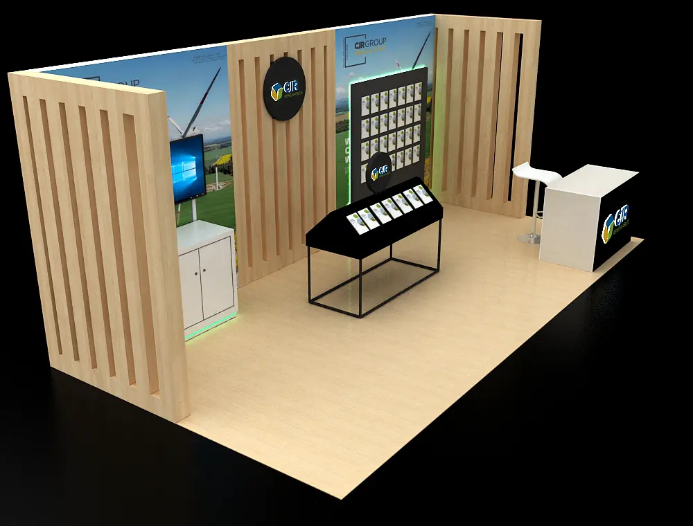 This 10x20 exhibit features a central graphic wall flanked by two vertical wood-slat structures. The layout includes a dedicated media station with a monitor and storage on the left. The center showcases a slanted product display table and a multi-pocket literature wall. A branded reception counter is placed at the entrance, all on a light wood floor.