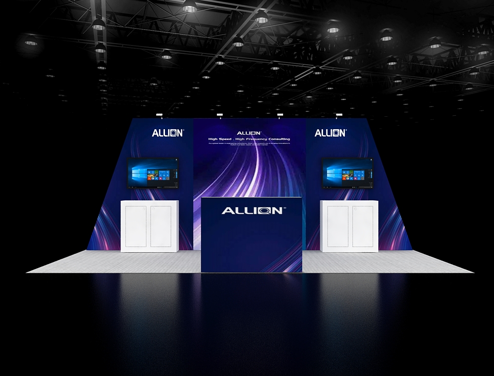 This 10x20 trade show booth boasts a strong symmetrical design with a striking full-height graphic backdrop. It features twin presentation stations, each equipped with a monitor and a white storage cabinet below. A prominent branded podium anchors the front of the display, which is defined by a textured gray carpet and dark blue accents.