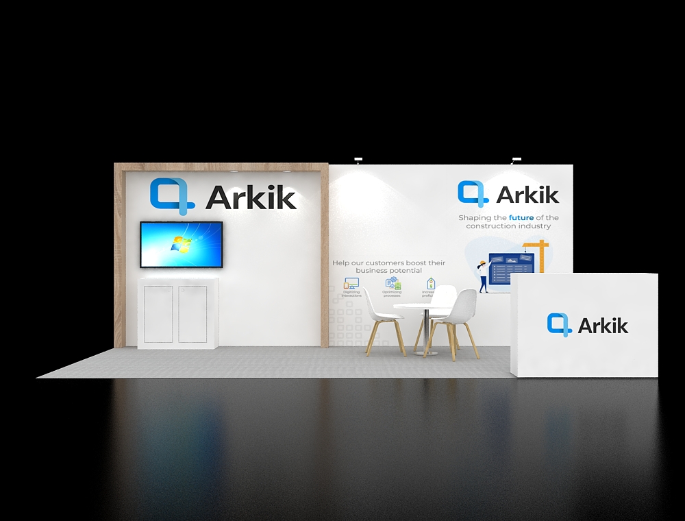 This 10x20 trade show display is characterized by a wood-look corner frame highlighting a dedicated media monitor and storage cabinet. The central area features a small round table and two chairs for client discussions. The exhibit is completed by a clean graphic back wall and a freestanding branded reception counter placed near the entrance.