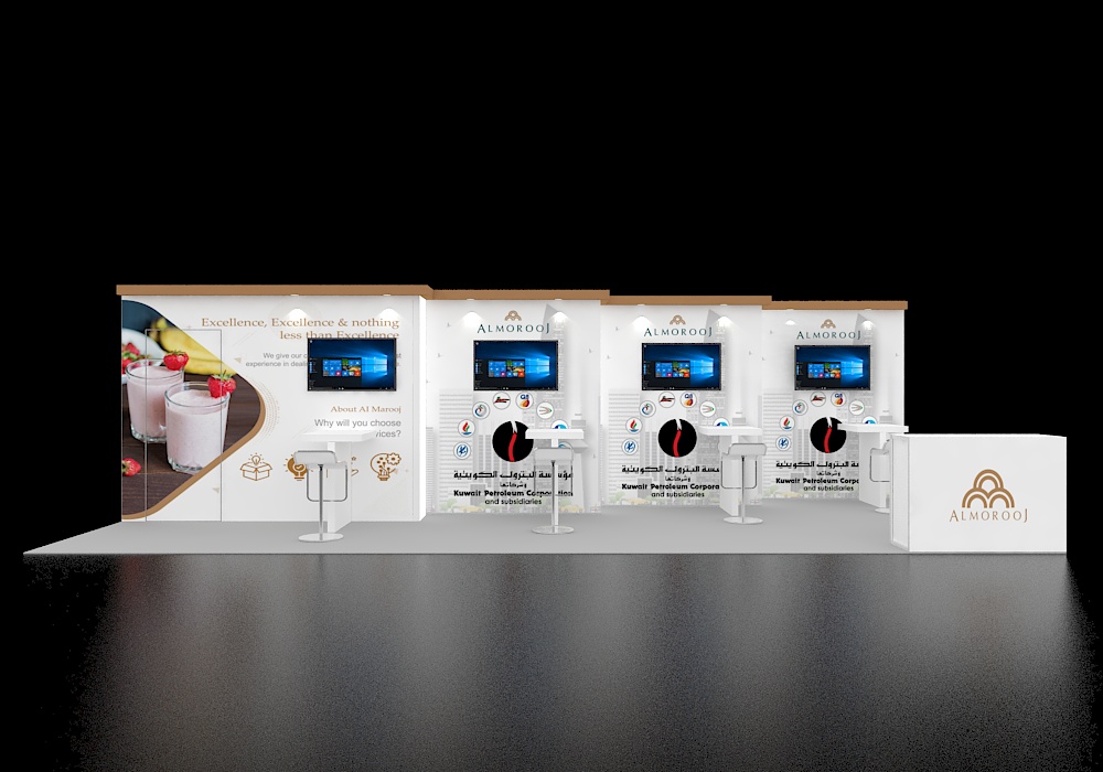 10x30 Exhibit - Corner Lounge, High Bar, Monitor, and Central Pillar