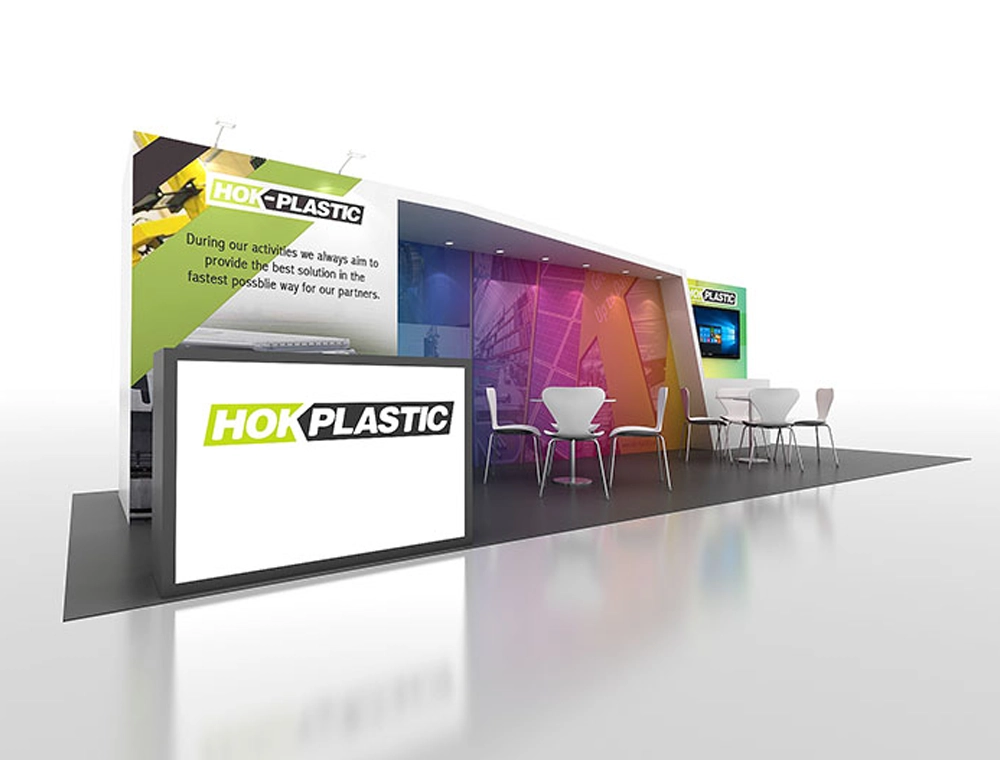 The images display three unique 10x30 booth layouts: one features a central graphic wall with dual monitors and seating; another is a linear design with a large graphic display and side seating; and the third utilizes multiple seating groups and a demo screen station. All designs maximize visibility with full-scale backwalls.