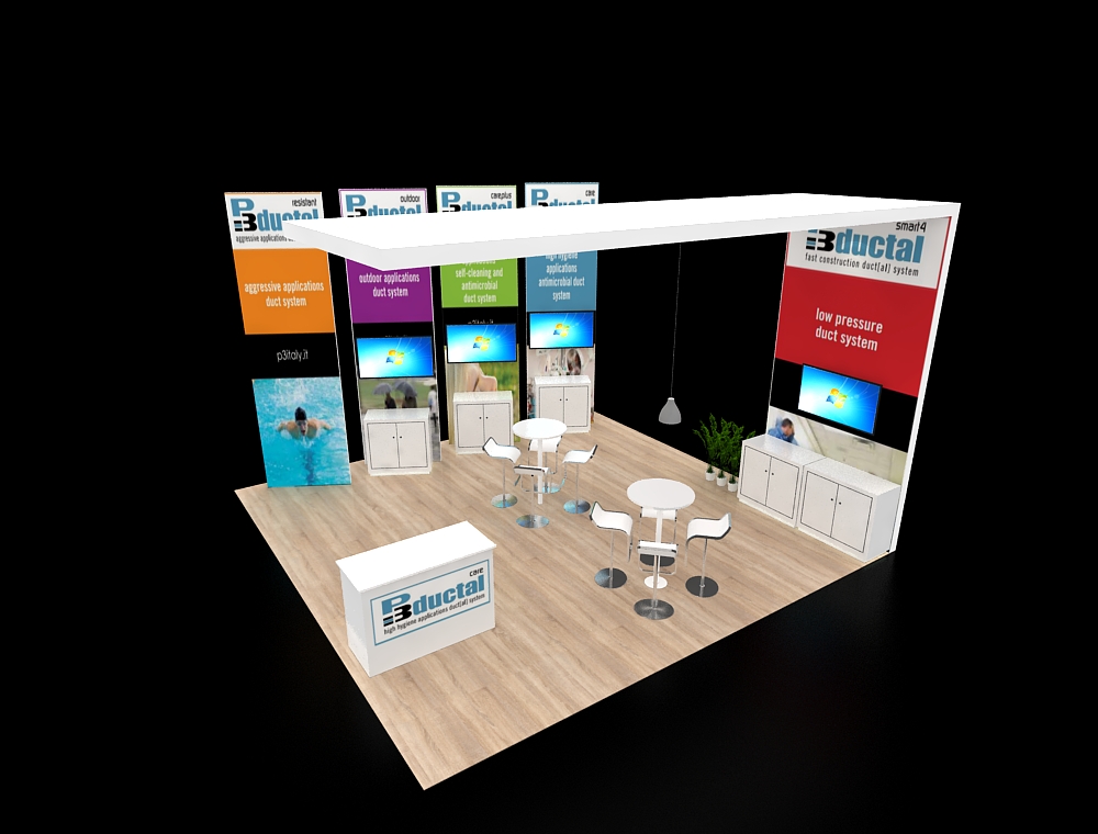 This 20x20 exhibit features a broad white overhead canopy and a multi-display video wall. It includes a dedicated presentation area with a prominent red graphic panel, a central counter, high-top seating, and light-tone wood flooring, creating distinct zones for engagement.