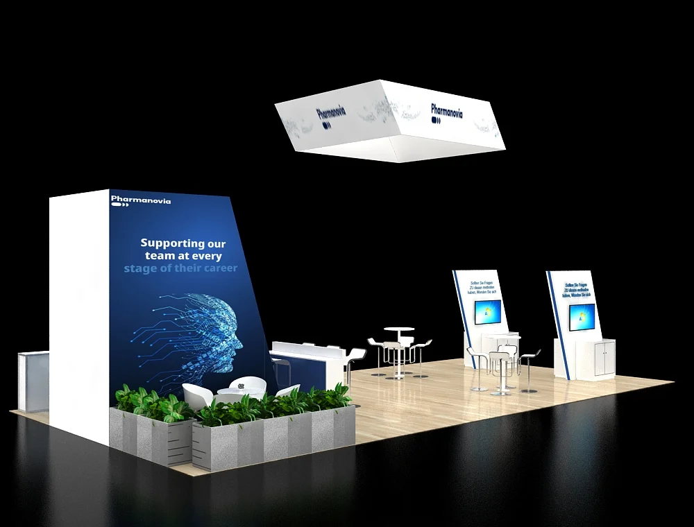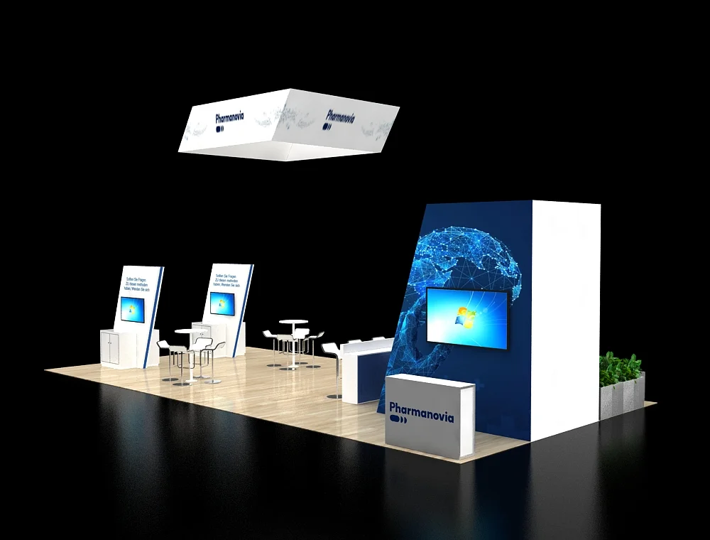 This 20x30 stand incorporates an eye-catching overhead cube sign and a large media wall for presentations. The structure features vertical wood-slat accents and a custom angled pylon. It includes a vibrant blue lounge area with soft seating, a central high-top table, and integrated demo counters, all on a light wood-effect floor.
