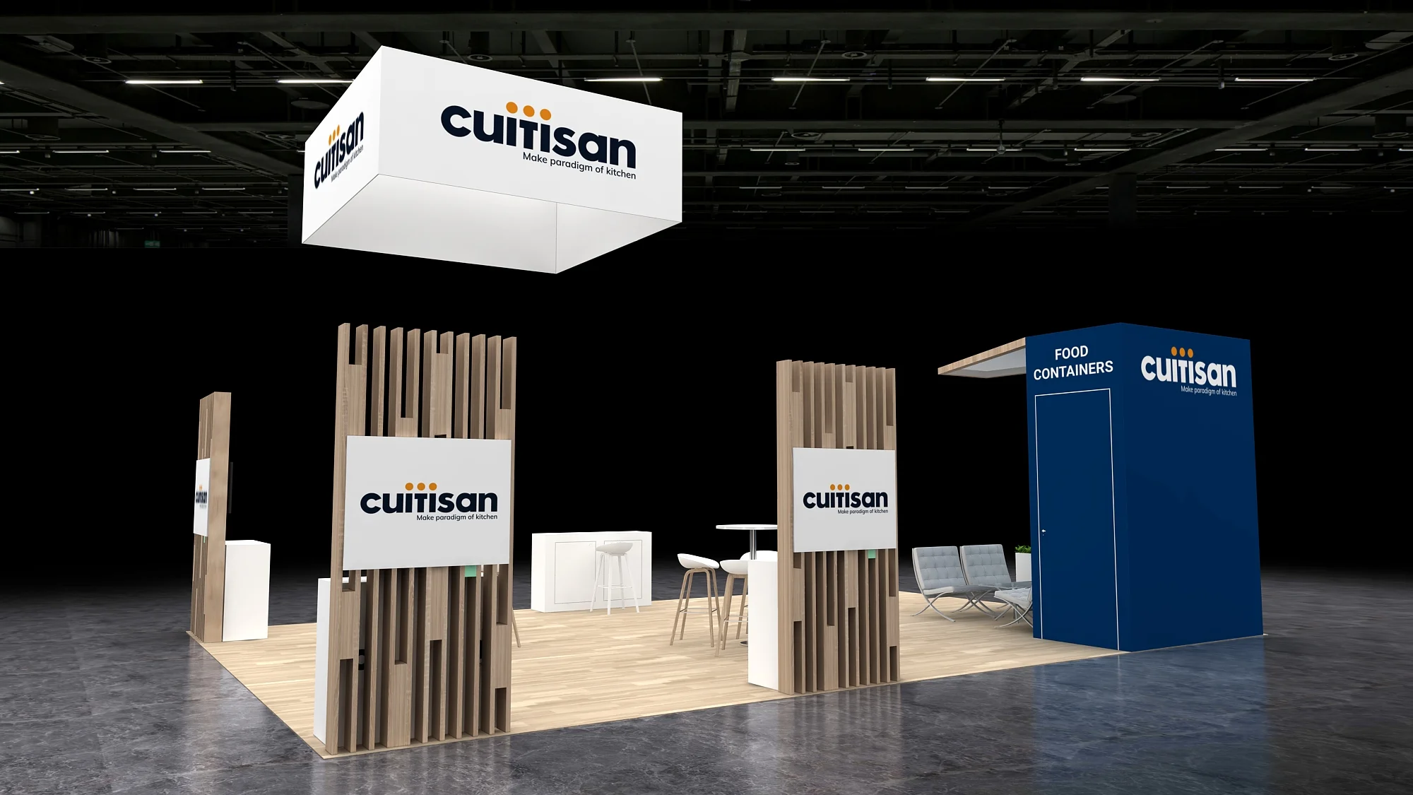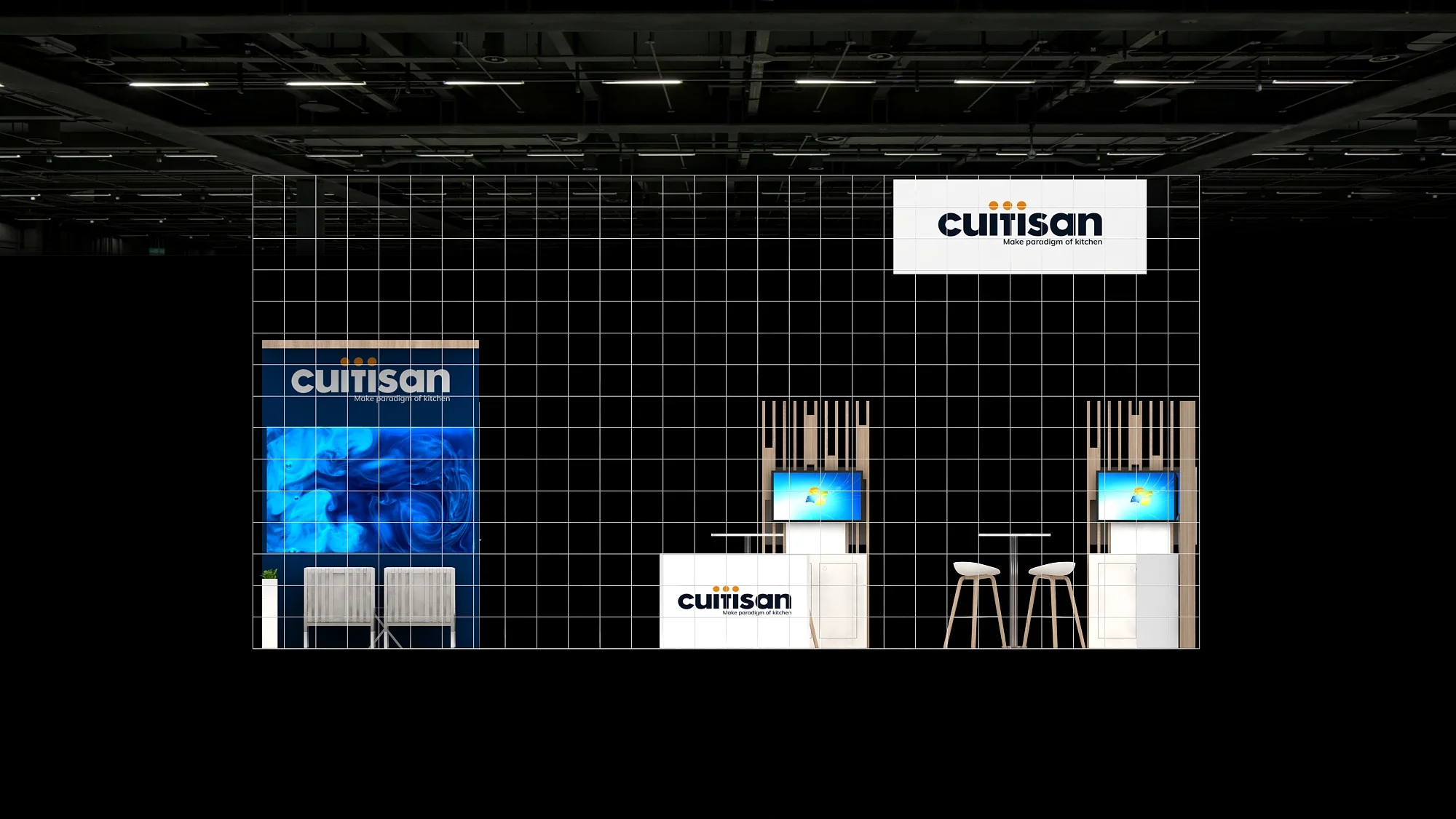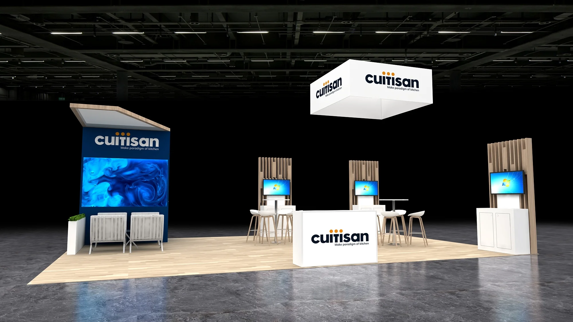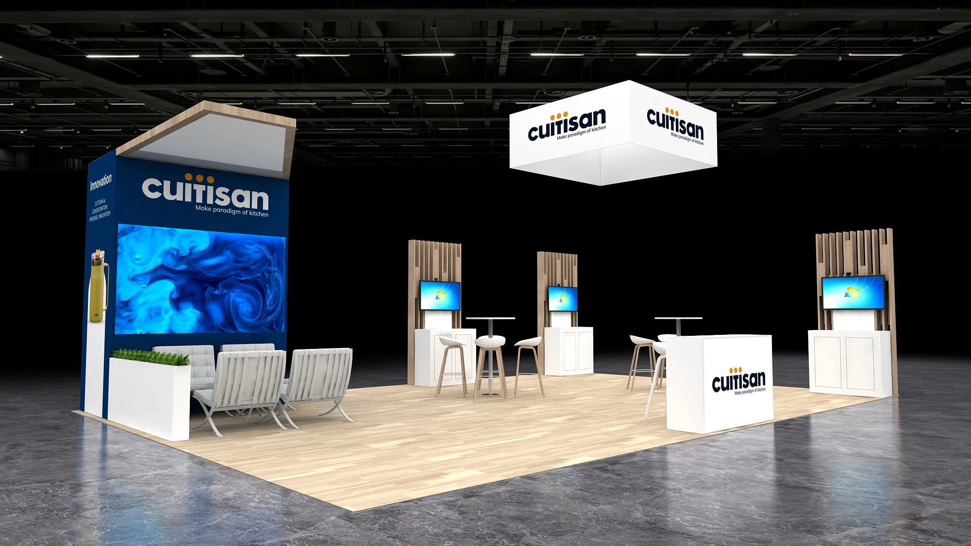 20x30 Stand: Elevated Sign, Lounge Area, and Demo Stations