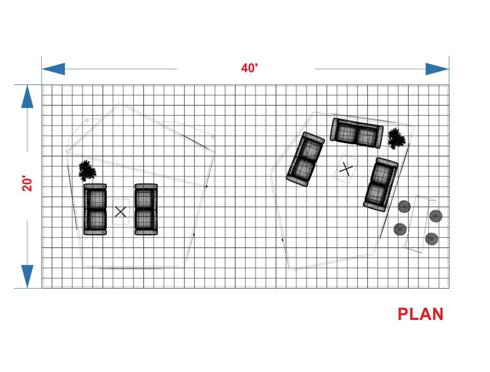 This 20x30 display is characterized by a dramatic, blue-accented angled overhead canopy. The floor space is divided by two main graphic cubes. It features multiple integrated screens for media content, a high-top counter, and two small display pedestals, all set on light-colored flooring.