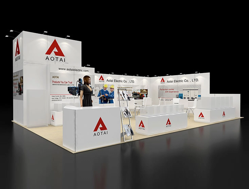 This 20x30 exhibit presents a wide-format graphic backdrop featuring distinct high walls and branding opportunities. It includes a welcome counter, several large display pedestals, and dedicated seating areas. The open design maximizes visitor flow and accessibility.