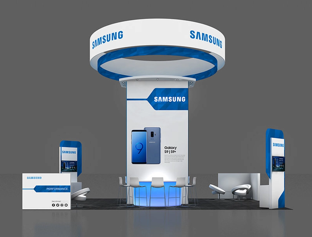 This 20x30 display features three prominent suspended cube signs and an open white structure. The layout includes a front reception counter, integrated shelving for product display, and a lounge area with white seating. Graphic pillars and a large side wall provide ample space for large-format visuals.