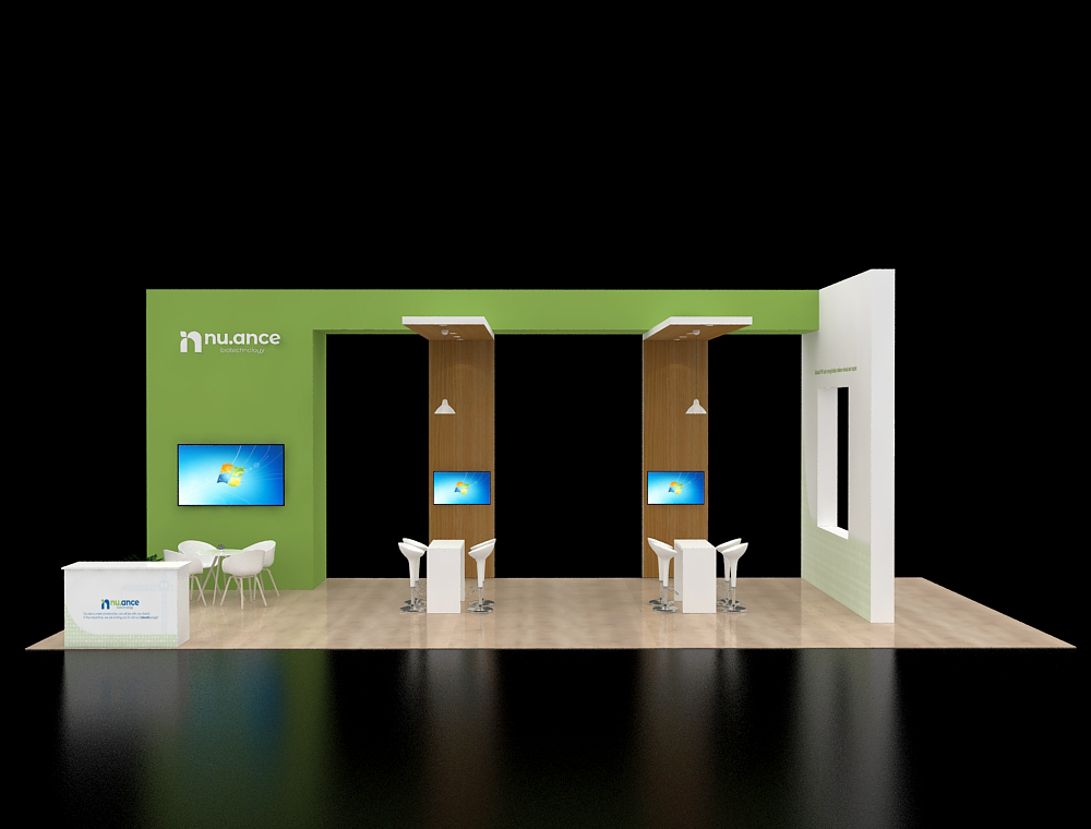 This 20x40 island booth features distinct dark blue and light wood structural elements and contrasting white furniture. The open layout showcases a central wood-paneled wall, multiple media points, and two separate visitor seating areas—one utilizing chairs and tables, the other featuring modular low cube seating.