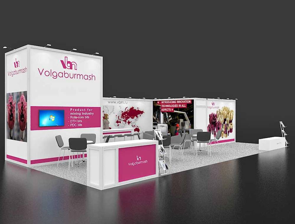 This 20x40 island booth features a striking pink and white theme with a large overhead sign and central cube-shaped tower. The design incorporates multiple triangular and square display kiosks, two four-chair seating arrangements, and dedicated media points, offering various areas for product interaction and small group meetings on light gray flooring.