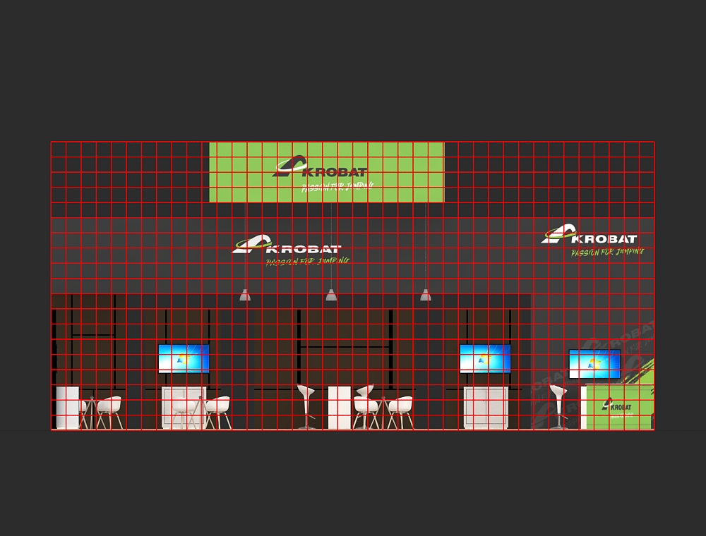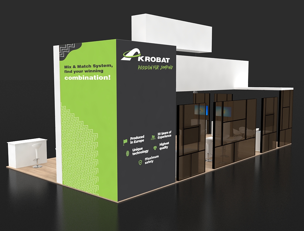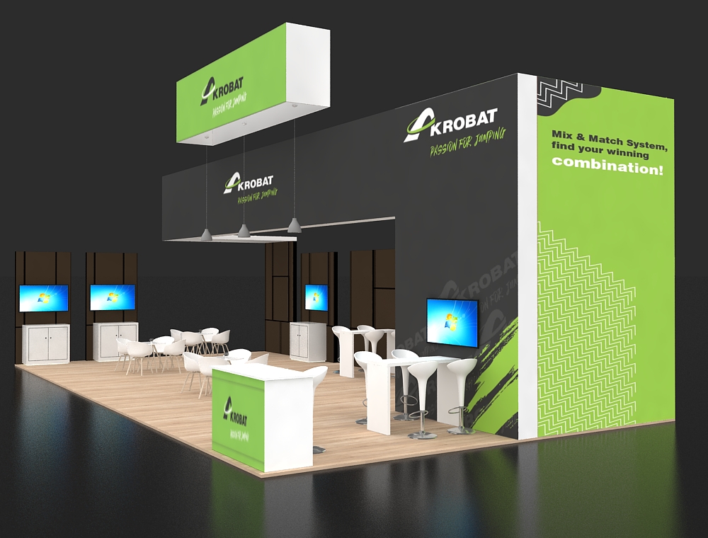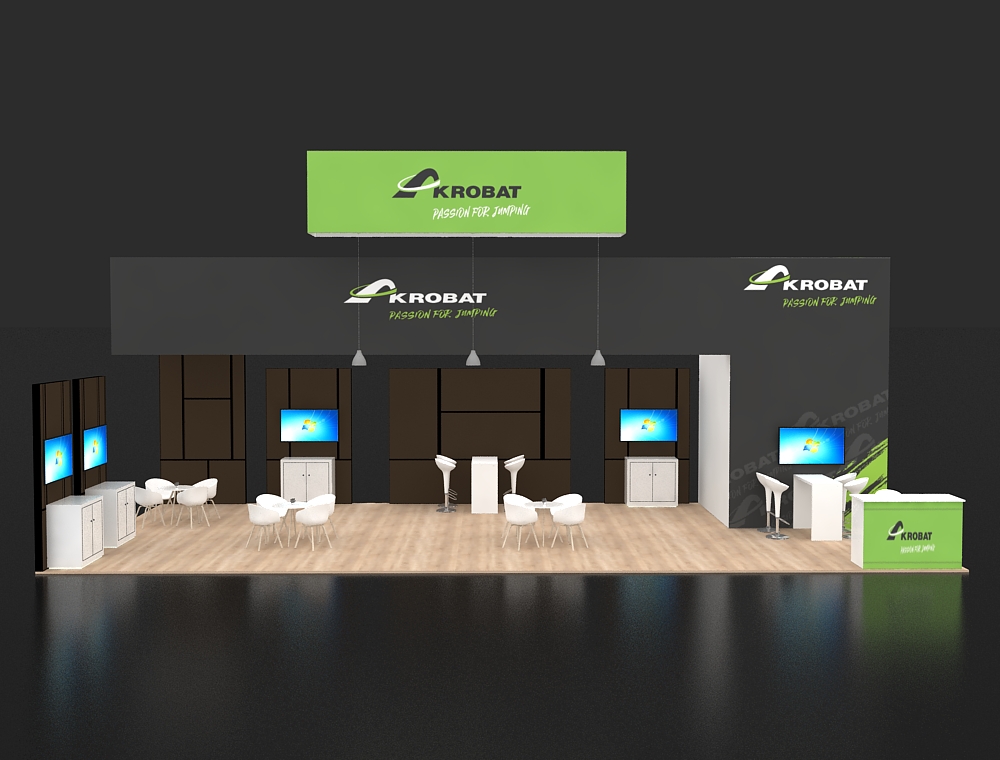 This 20x40 exhibit features a large black graphic wall and a prominent green overhead rectangular sign. The design incorporates two side presentation kiosks and a central reception counter, with a total of four monitors visible for multimedia content. Multiple white seating clusters and wood-look flooring define the open visitor lounge area.