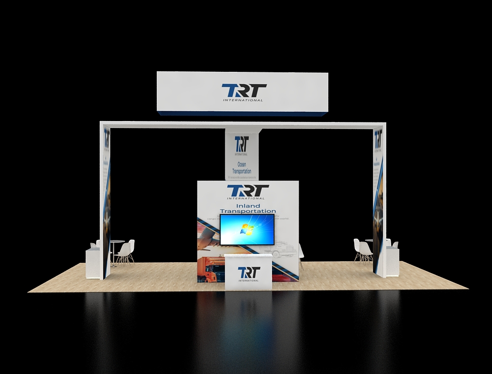 This 20x40 exhibit features a large, white overhead rectangular sign and a wide, open-sided archway structure. Three monitors are included: one on a central graphic tower and two on side kiosks integrated into the archway posts. Two distinct lounge areas with white furniture and a light wood-look floor define the space. There are a total of three monitors in this display.