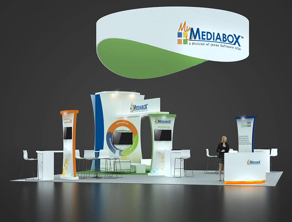 This 30x30 floor plan is anchored by a large white overhead canopy featuring blue interior accents. Two tall primary pillars house digital displays and integrated shelving for high-impact visual engagement. The layout includes a central lounge with white modular seating, complemented by side meeting areas with high tables and stools to facilitate professional networking.