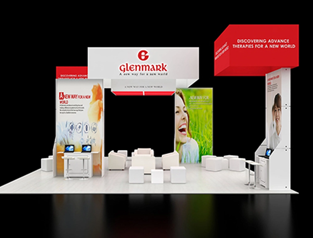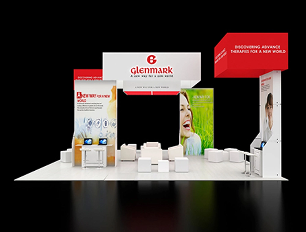 This 30x30 floor plan is anchored by a large white overhead canopy featuring blue interior accents. Two tall primary pillars house digital displays and integrated shelving for high-impact visual engagement. The layout includes a central lounge with white modular seating, complemented by side meeting areas with high tables and stools to facilitate professional networking.