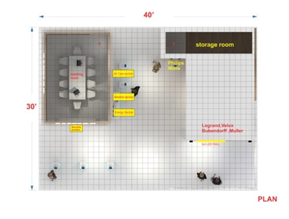 This 30x40 exhibit space features a light wood-grain floor and a prominent orange square canopy suspended above a private white storage room. The architecture includes a long slatted wood pergola extending over a digital media wall and communal seating zones. Multiple engagement areas with white high-top stools, pedestal tables, and integrated display pylons provide a professional environment for various visitor interactions.