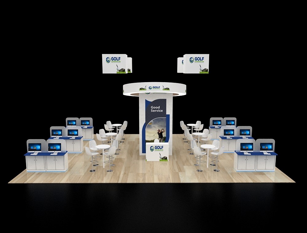 This 30x40 island booth is defined by four large suspended cube signs and a central illuminated column. The expansive layout integrates multiple perimeter workstations and high-top seating areas for visitor interaction. Polished wood-grain flooring spans the entire space, while white and blue accents on the modular storage cabinets provide a professional, organized environment optimized for high-traffic engagement.