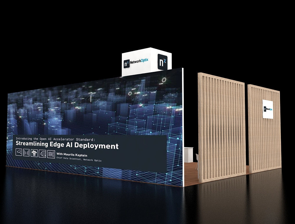 Defined by a large L-shaped suspended header for high-level visibility, this 30x40 floor plan utilizes three freestanding graphic towers equipped with digital displays. The open layout features a welcoming front reception counter and several white interaction pedestals with storage. Modern white seating sets are distributed throughout the space, all set upon a clean, uniform gray professional floor.