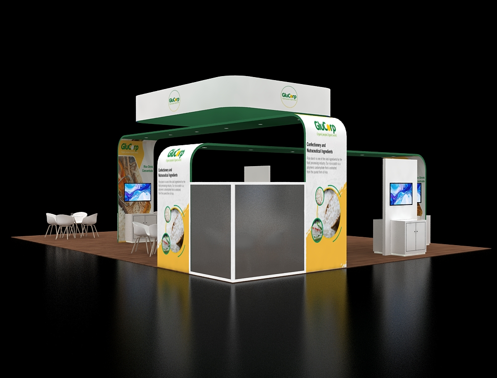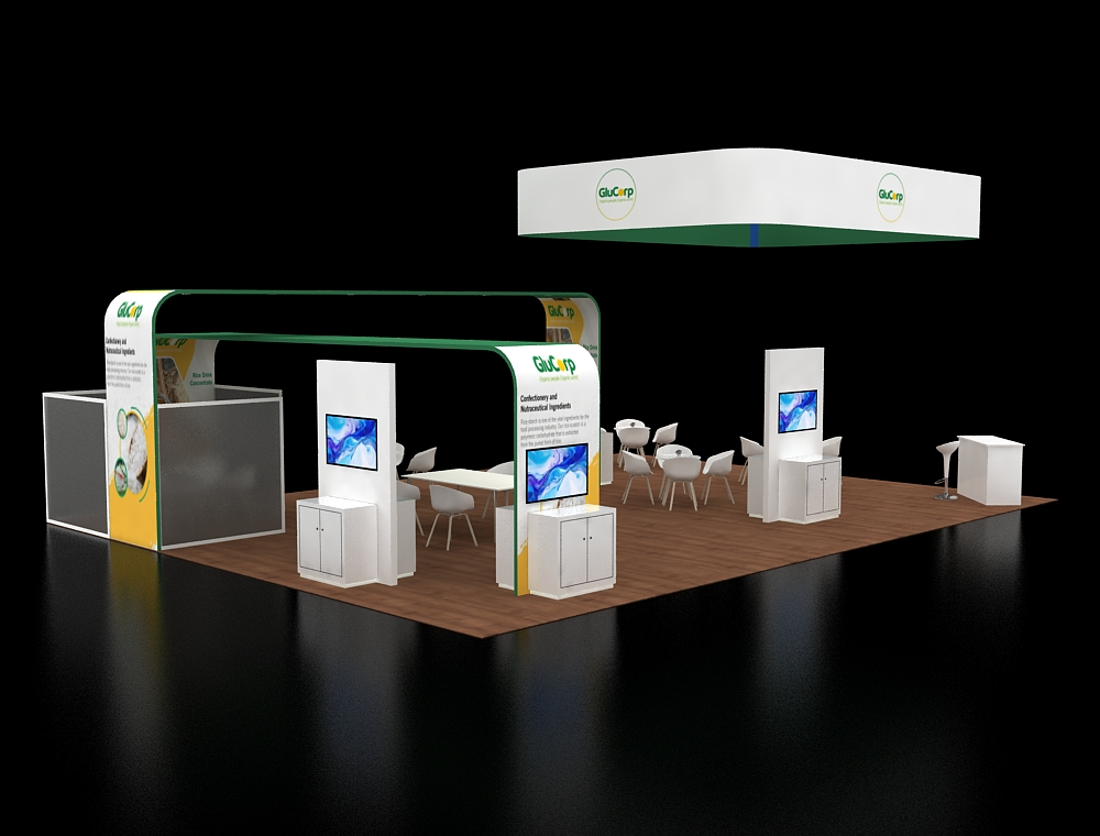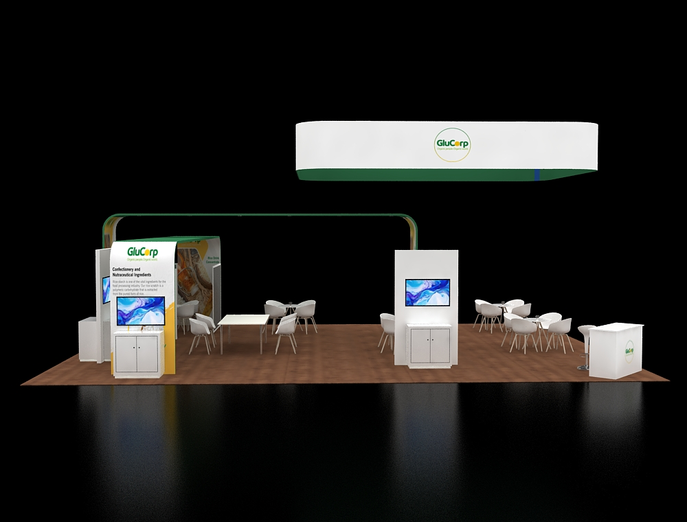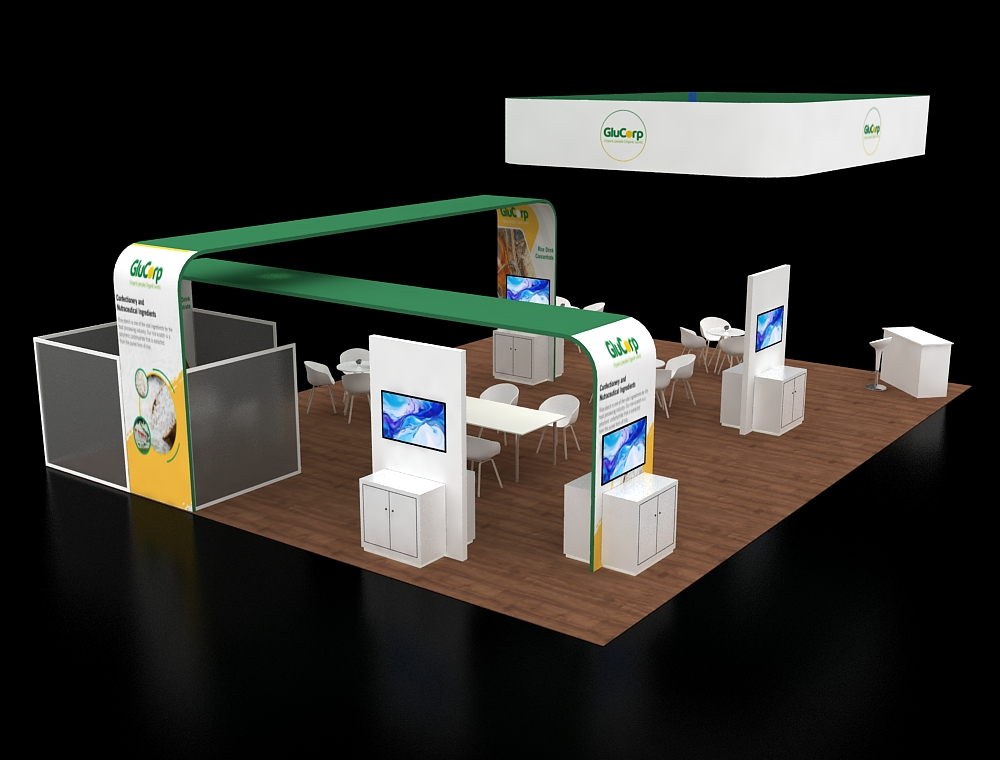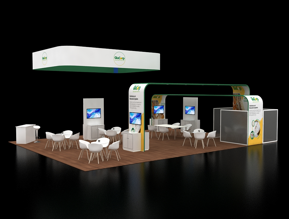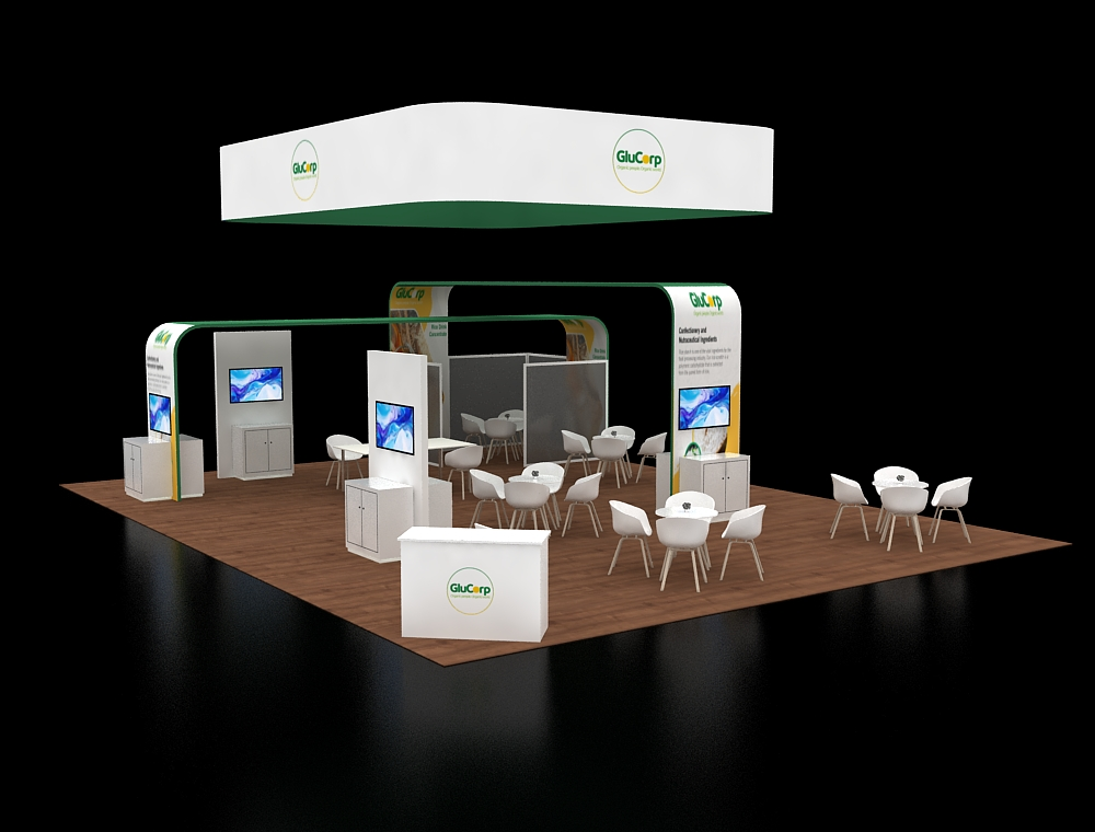 Designed for a 30x40 footprint, this exhibit features a massive square overhead hanging sign to maximize visibility. The layout is anchored by two large, arched branding girders that frame the interior space. Within the open floor plan, multiple white seating clusters and dedicated information pedestals with digital screens provide varied areas for professional visitor interaction.