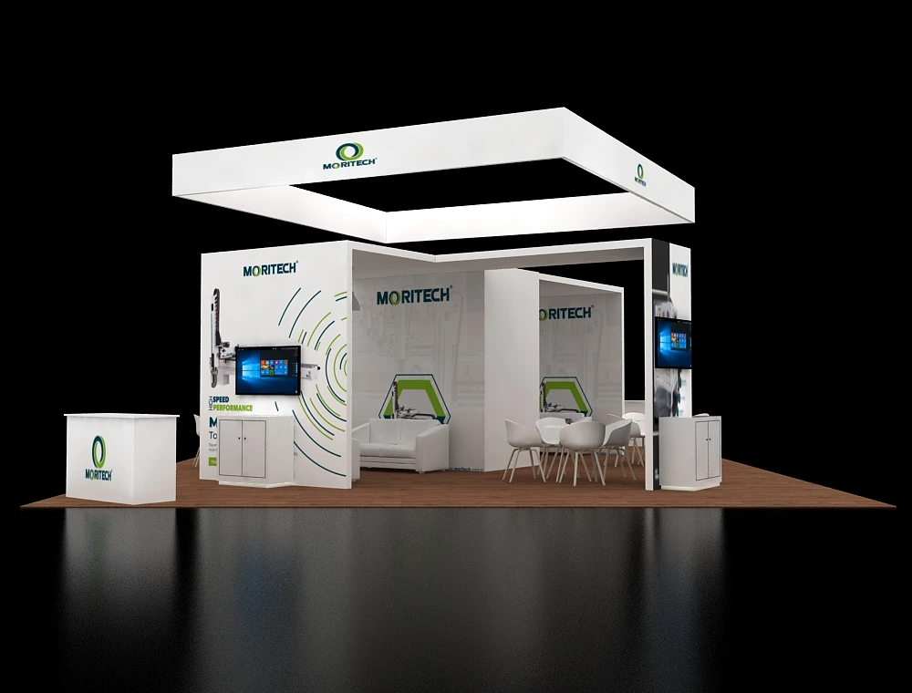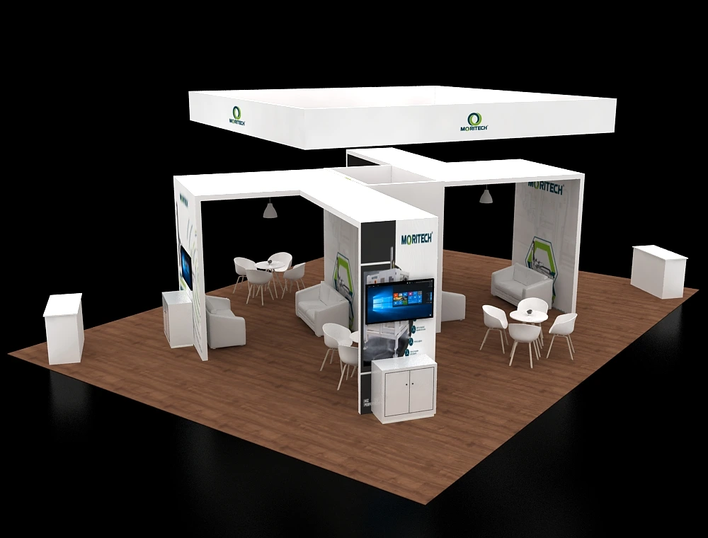 This 30x40 exhibit footprint is defined by a massive overhead square branding banner that ensures high-level visibility across the hall. Two towering side pillars flank an expansive central graphic wall, creating a primary visual anchor for the space. The layout incorporates a front-facing welcome counter, multiple seating clusters for networking, and integrated digital display panels set into the architectural pillars.