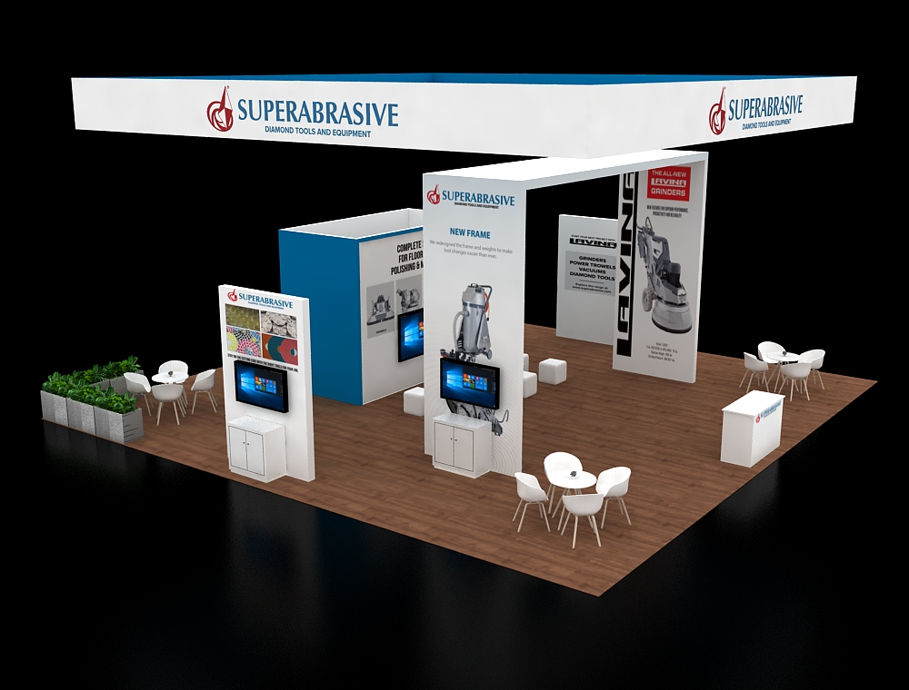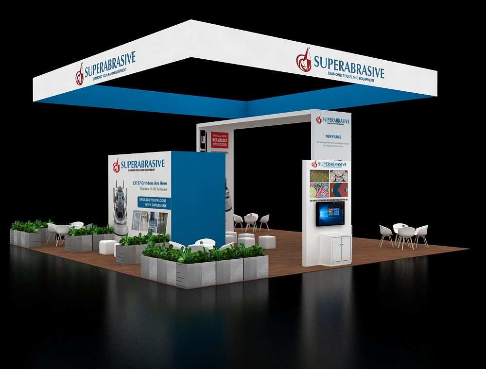 This 40x40 professional layout is defined by a prominent tapered overhead banner and rich wood-textured flooring. The architecture includes a tall L-shaped structural beam on the left and a centralized graphic backdrop. Functionality is maximized through two elongated high-top counters with stools, two circular meeting sets, and a standalone reception desk positioned at the very front.