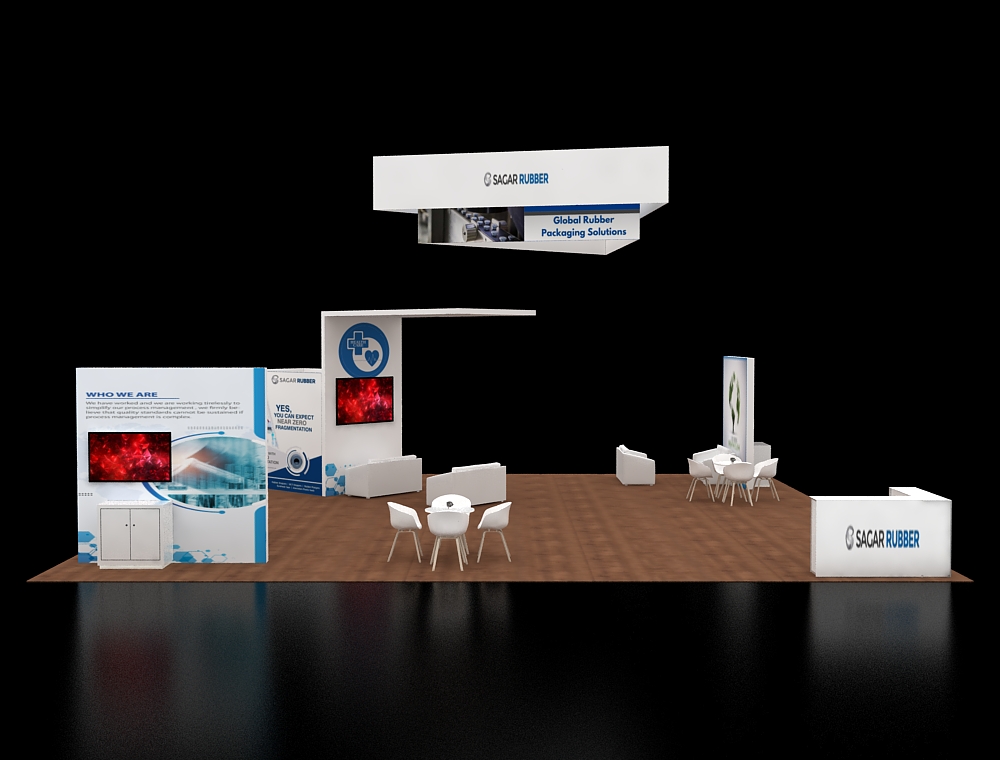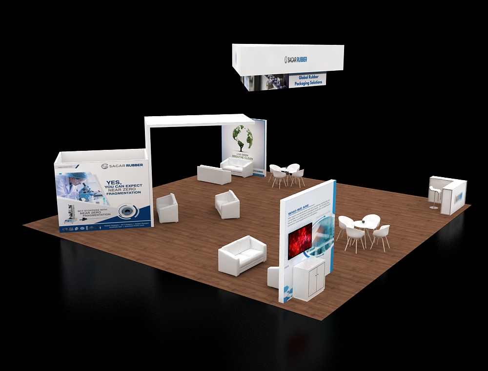 This 40x40 island layout features a substantial white rectangular box canopy and a warm wood-textured floor. Architectural interest is generated by vertical timber slat dividers that house integrated digital media stations. The floor plan incorporates a clean reception counter at the perimeter, central graphic pillar walls, and multiple consultation zones furnished with modern white seating and potted greenery.