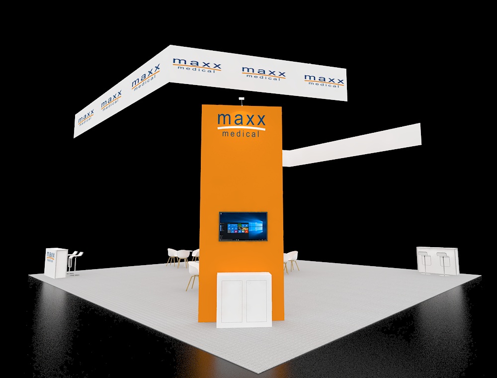 This 40x40 trade show booth utilizes a vast open layout anchored by tall corner pillars and a central angular partition. High-visibility hanging banners define the overhead space, while the floor plan features multiple consultation areas with modern white chairs. Two sleek reception counters are positioned at the perimeter, complemented by professional overhead arm lighting and a clean grey flooring finish.
