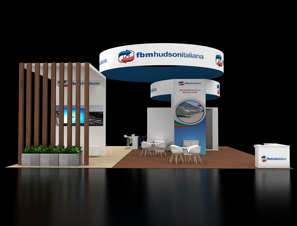 This 40x50 floor plan is defined by a tiered overhead branding system featuring two large suspended circular ring headers. The layout integrates a high-impact architectural backwall with a distinct vertical wood-slat privacy screen and integrated planter boxes. Multiple collaborative zones are distributed across the wood-textured flooring, including a front-facing reception counter, scattered cafe seating, and a vertical information pylon.