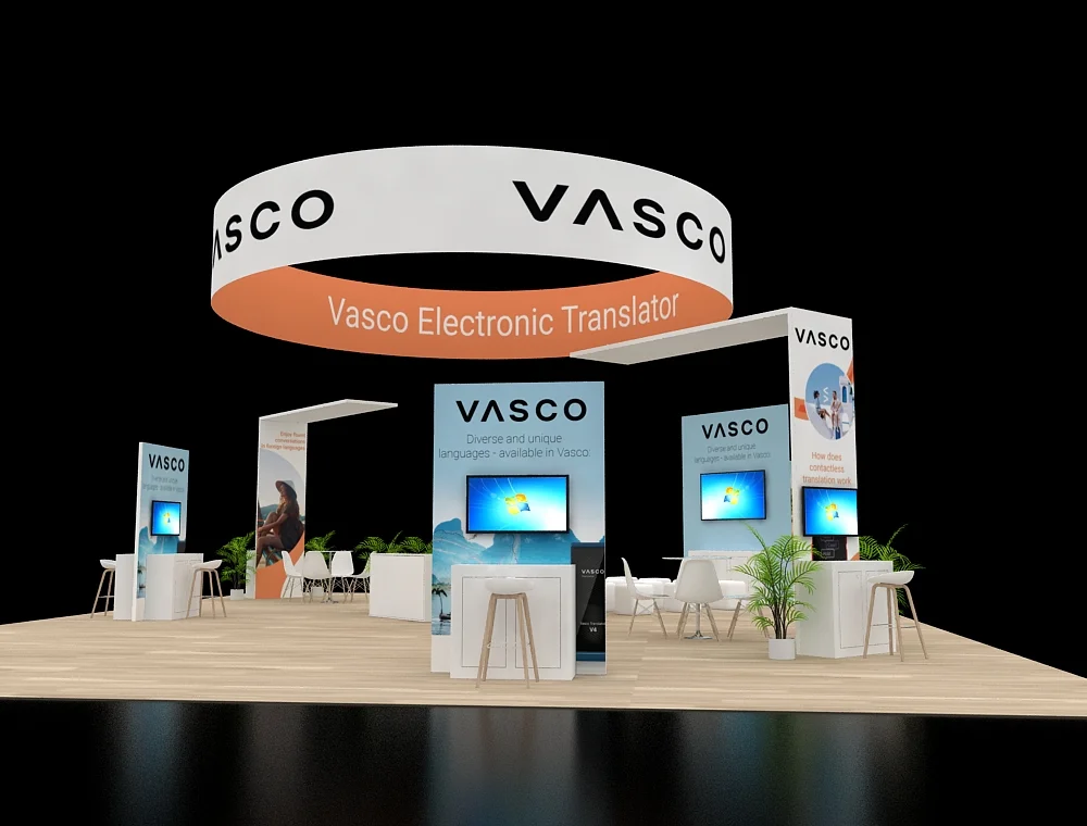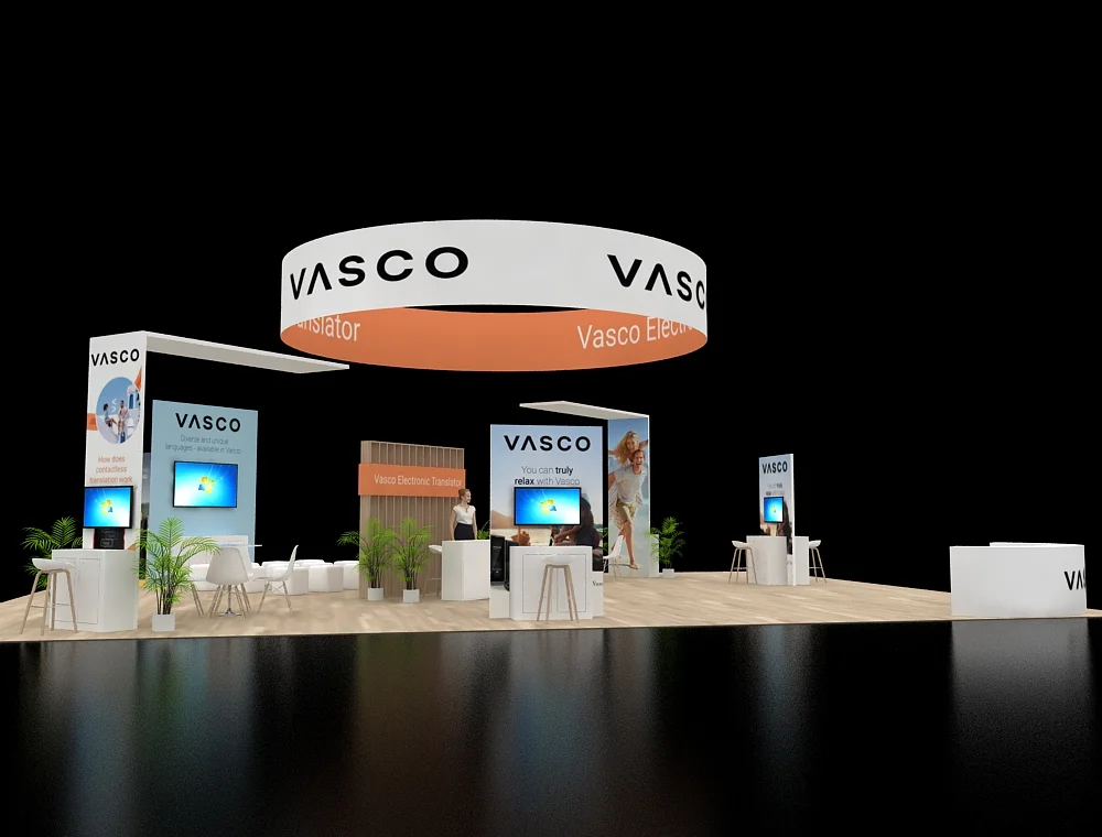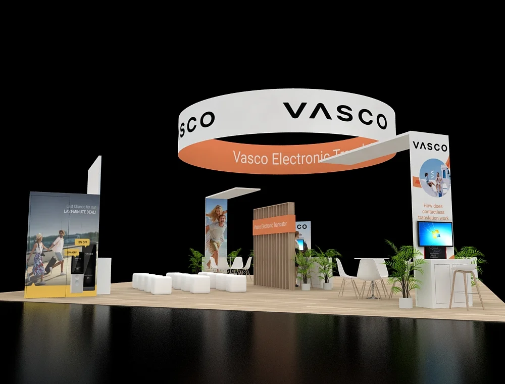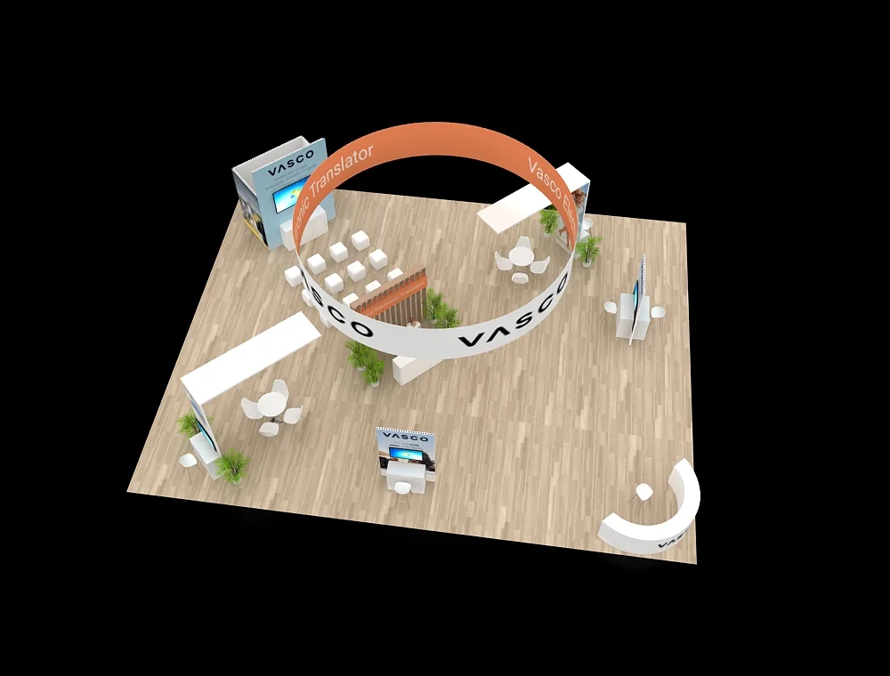 This 40x50 layout features a prominent circular overhead halo that defines the space and ensures long-distance visibility. The design utilizes twin reception counters at the front, complemented by two dedicated interactive demo stations. A central service desk sits against a slatted back wall, while open meeting areas and integrated greenery balance the modern, clean-lined structural aesthetic.