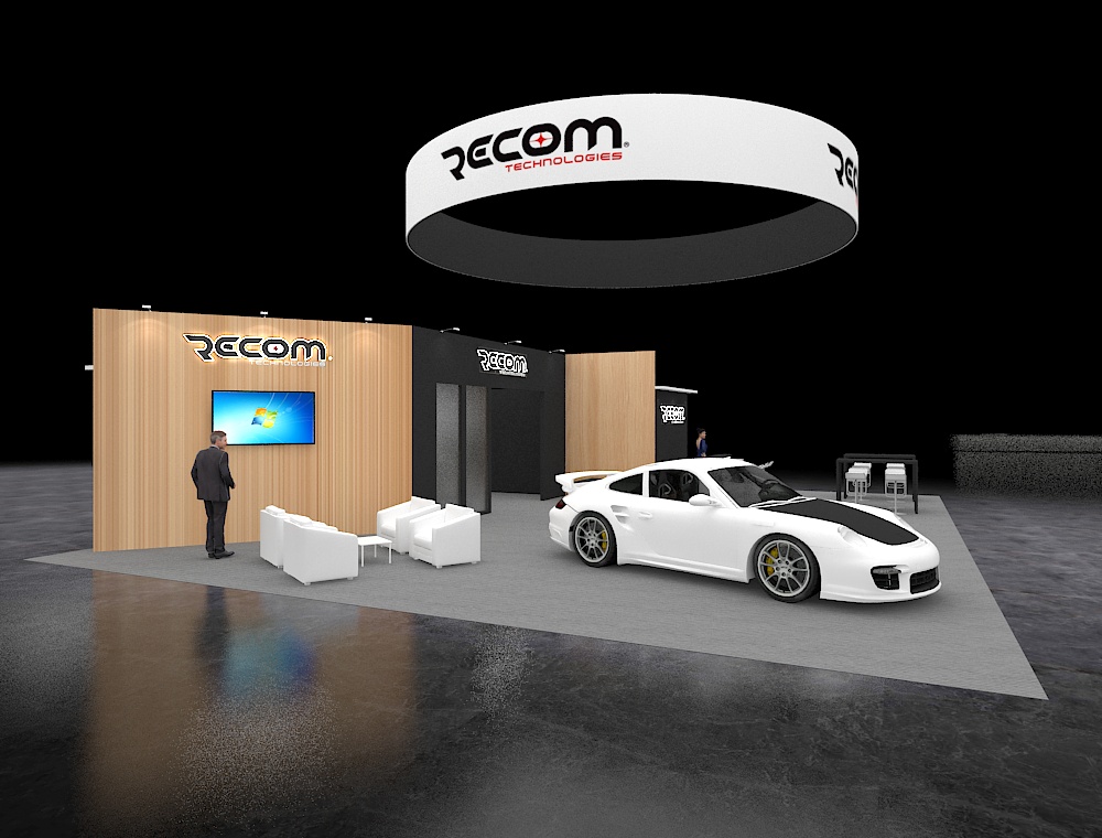 A massive suspended circular ring header defines the overhead space of this expansive 40x50 layout to ensure high-range visibility. The structural design integrates a multi-room backwall suite for private consultations alongside an open-concept floor plan. Features include a dedicated large-scale machinery display area, multiple high-top networking clusters, and a plush white lounge situated on a dual-textured gray carpet.